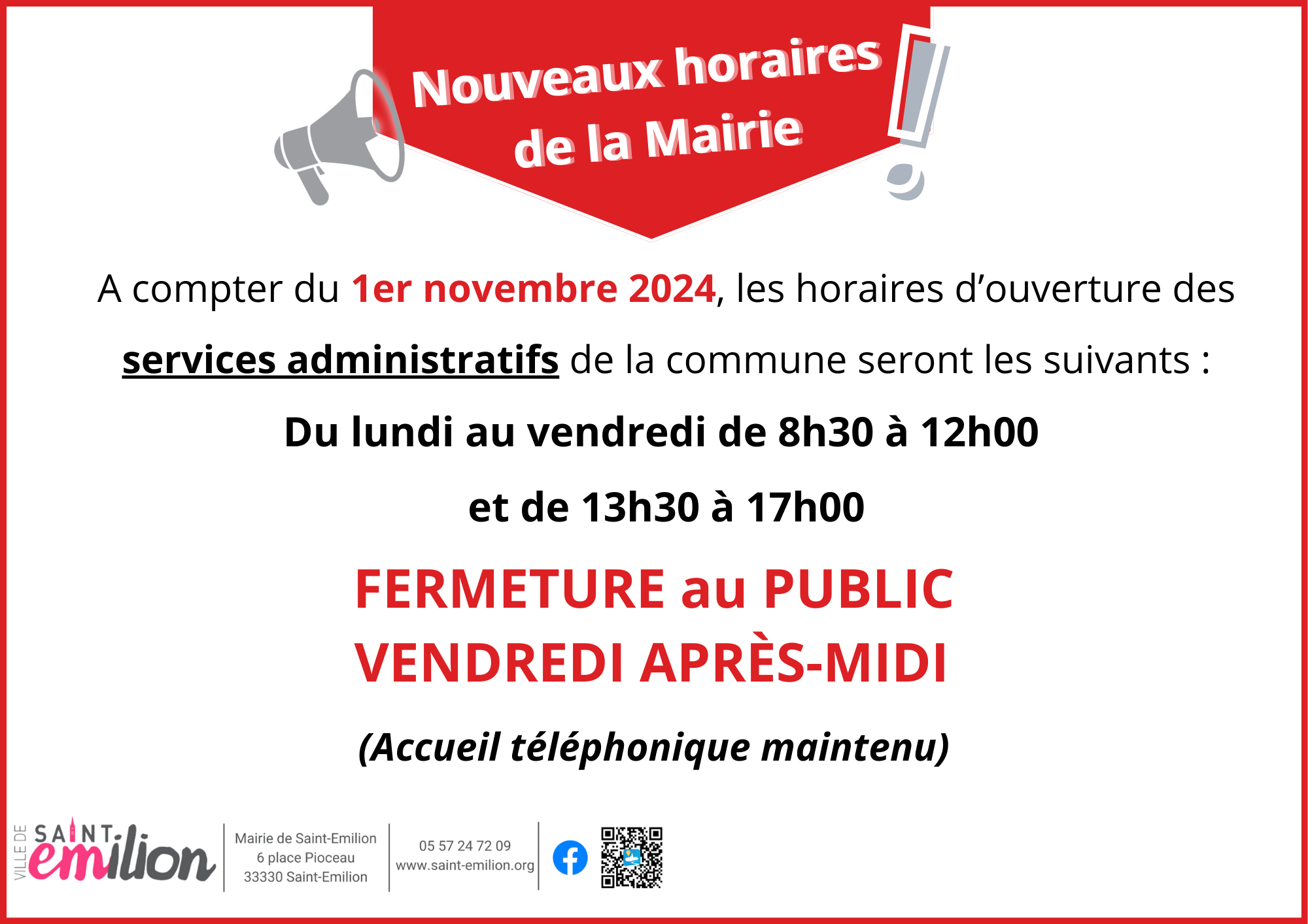 Voici les nouveaux horaires d'ouverture de la Mairie.