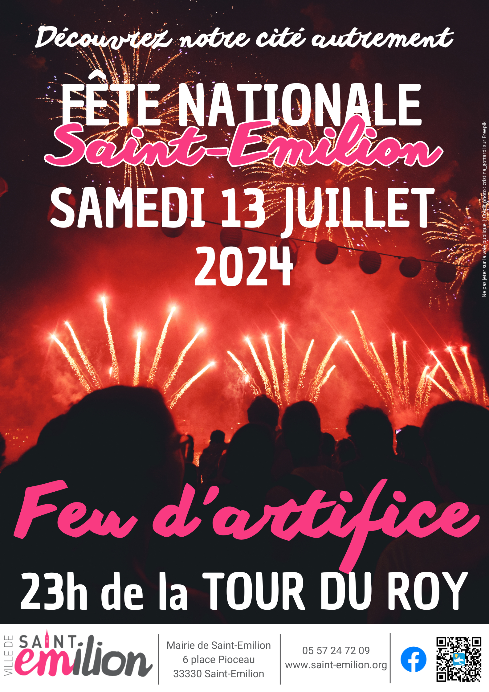 Vivez un spectacle extraordinaire avec le feu d'artifice tiré de la Tour du Roy à Saint-Emilion à 23h00 samedi 13 juillet à l'occasion de la fête nationale.